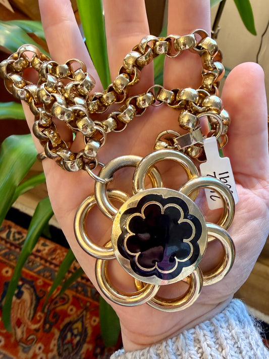 Chunky Gold Tone & Black Enamel Flower Necklace