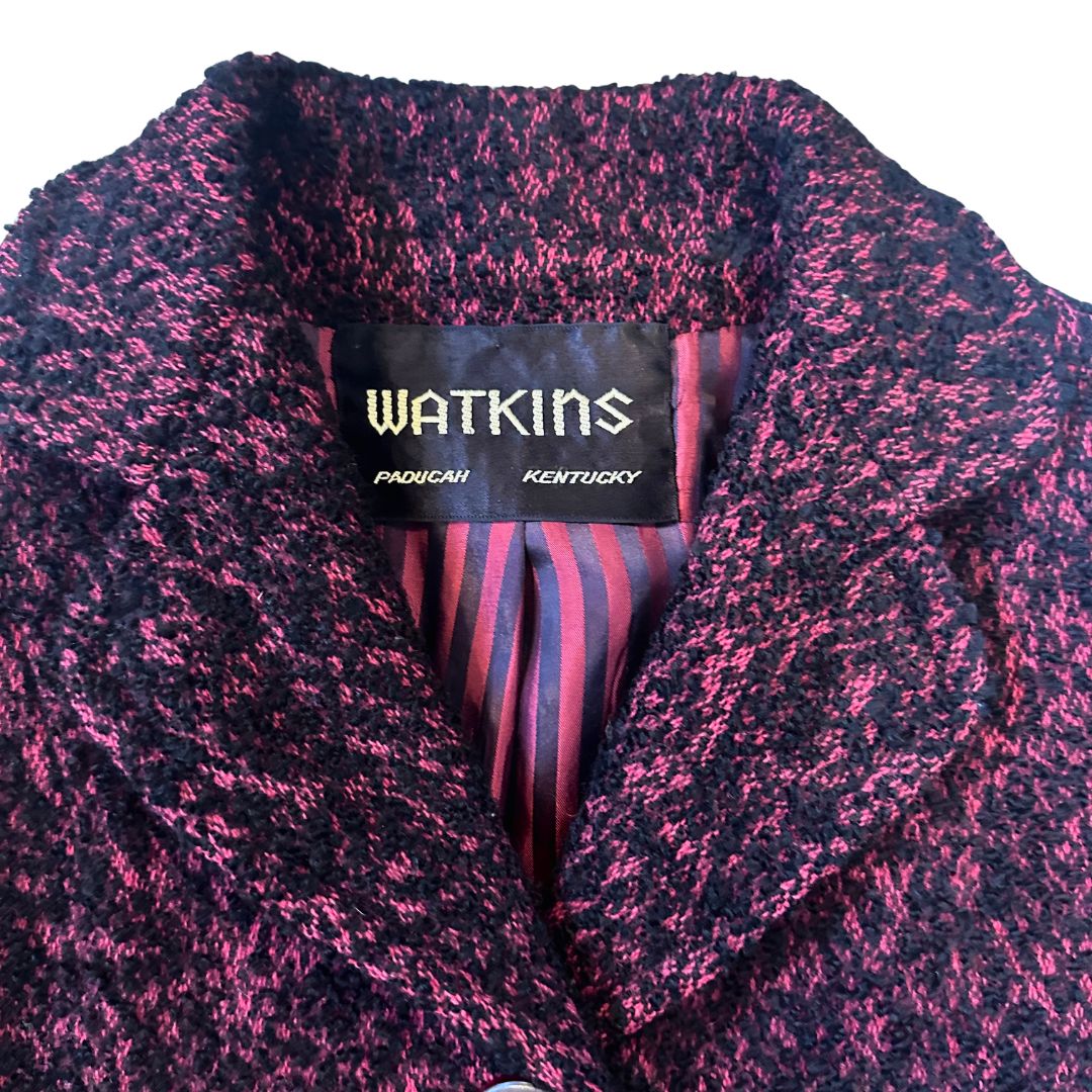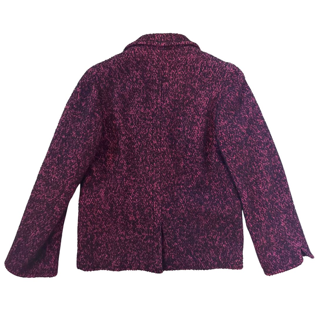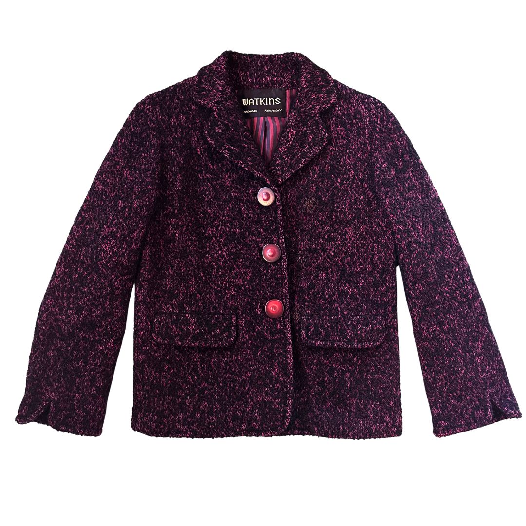 This vintage 1940's or potentially early 1950's tweedy jacket looks a bit like a blazer, but it's definitely heavy enough to be more of a jacket. The base is pink with a black fuzzy tweed, and it buttons with three very unusual, large, saucer-like buttons. The shoulders are very slightly padded. It does appear to have at least one visible mend, shown in the closeup photo of the buttons.