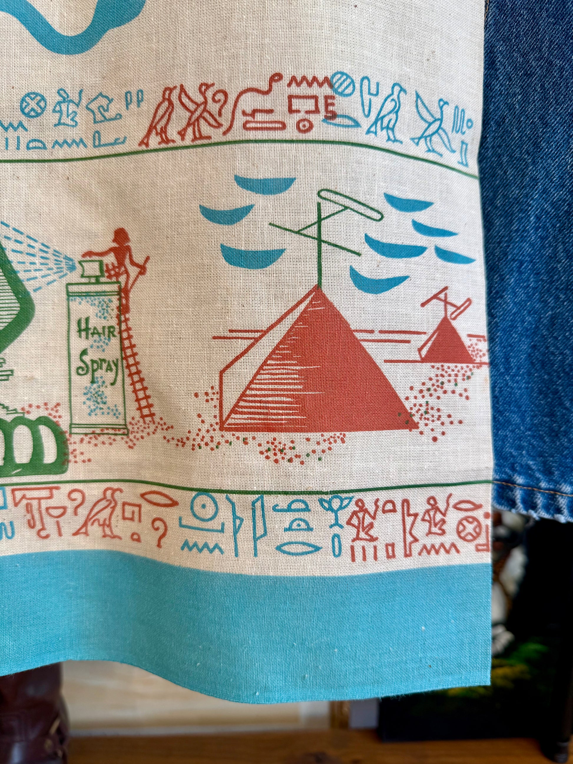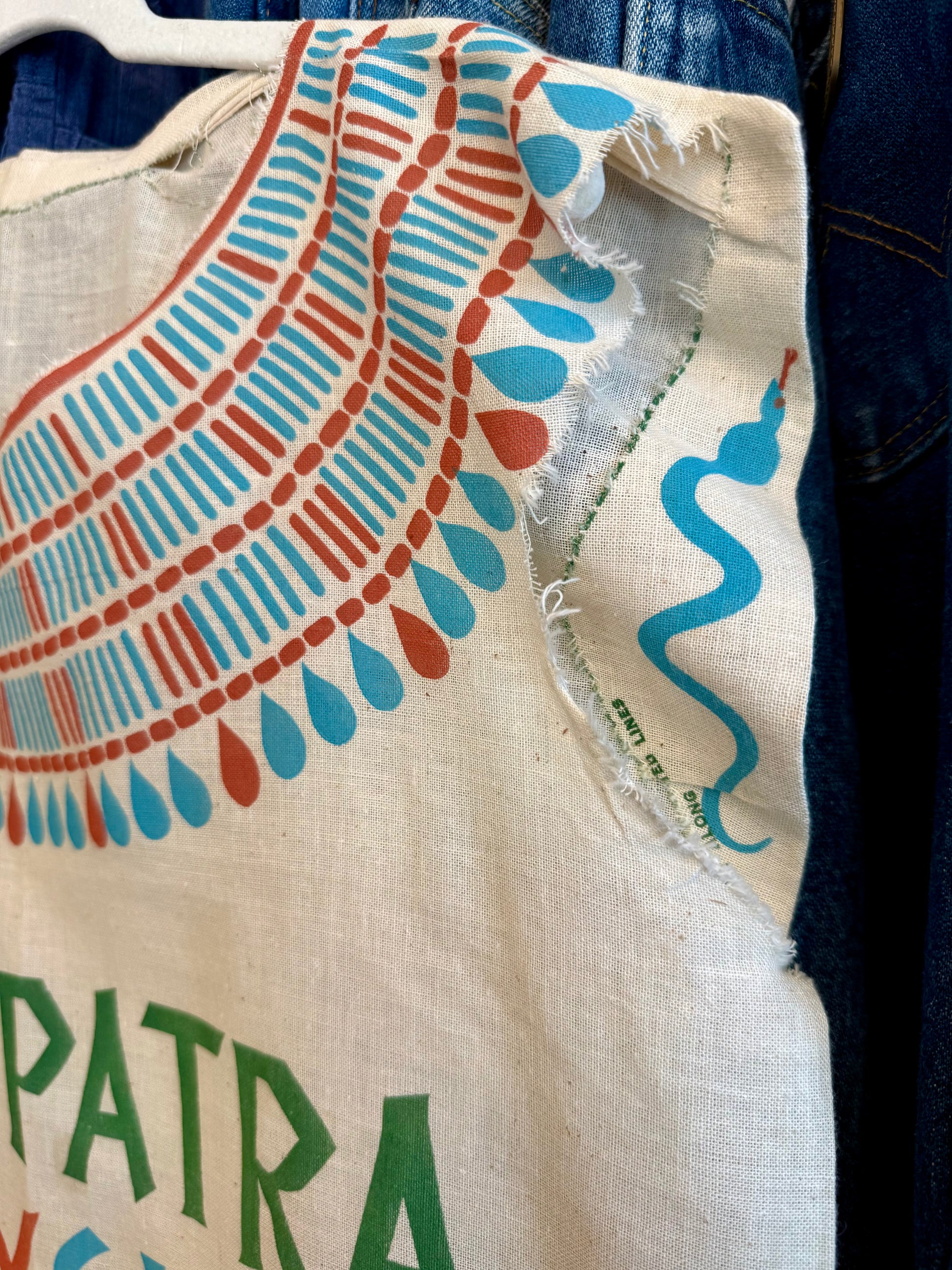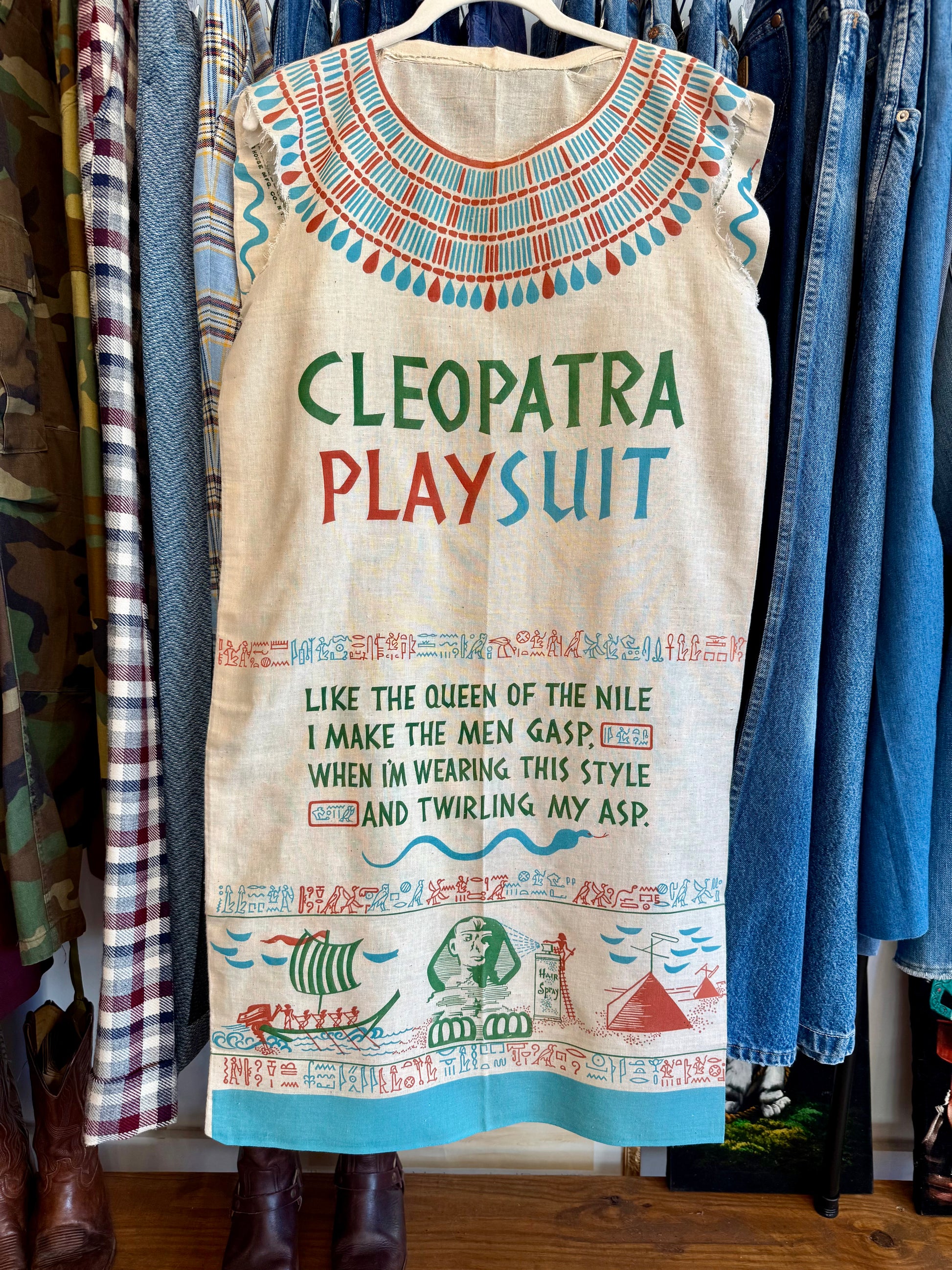 Ok, we’ve been holding on to this one for far too long, but it’s time for Cleopatra to make her debut! Vintage 1950’s/early 1960’s “Cleopatra Playsuit” feed sack dress with cheeky rhyme and graphics, definitely a collector’s piece. This one even comes with the “eyes,” which you don’t always see! The eyes are basically a piece of cut fabric (see photo), but you could still do something fun with them.