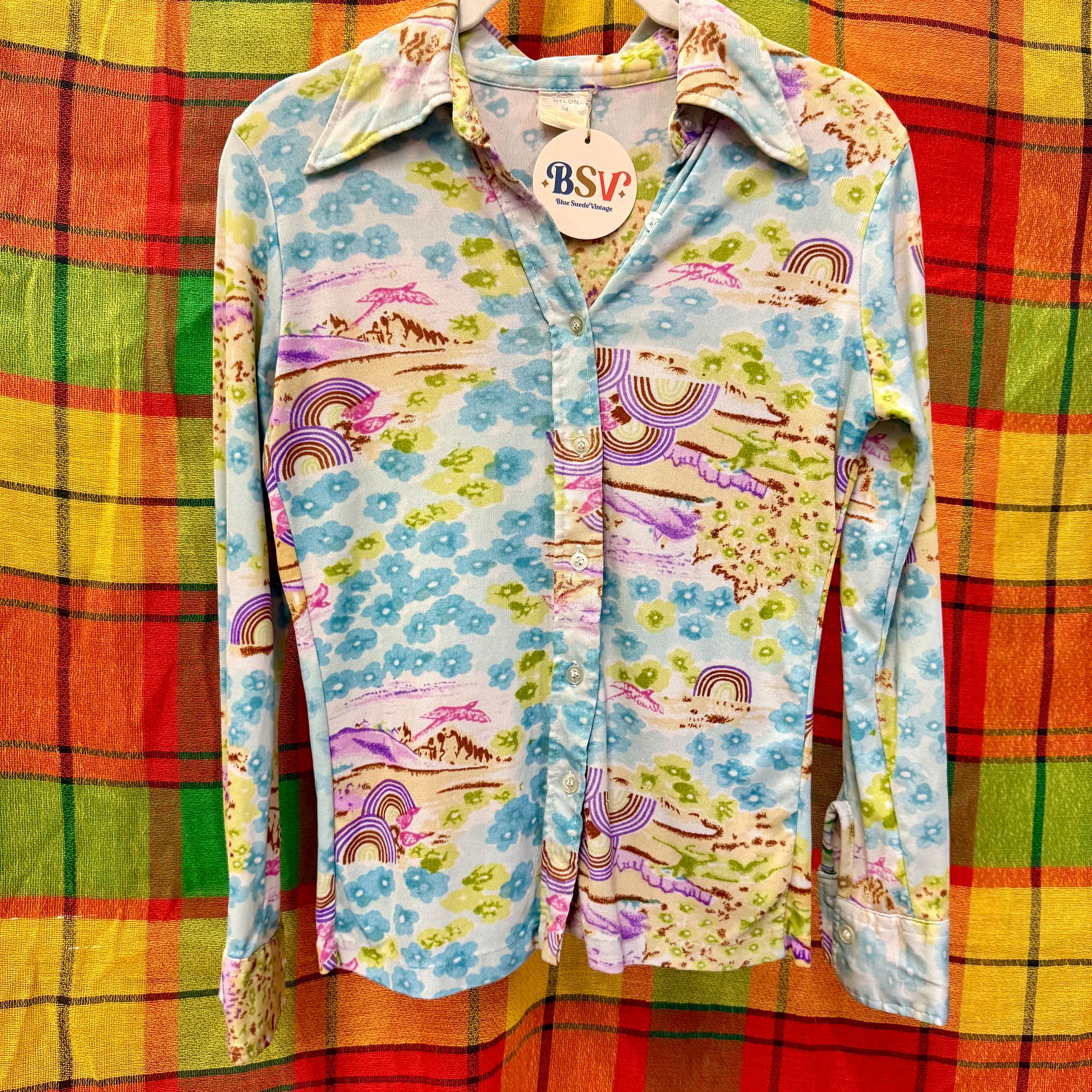 Dagger collar; stretchy, slinky fit; dreamy rainbow landscape scenes