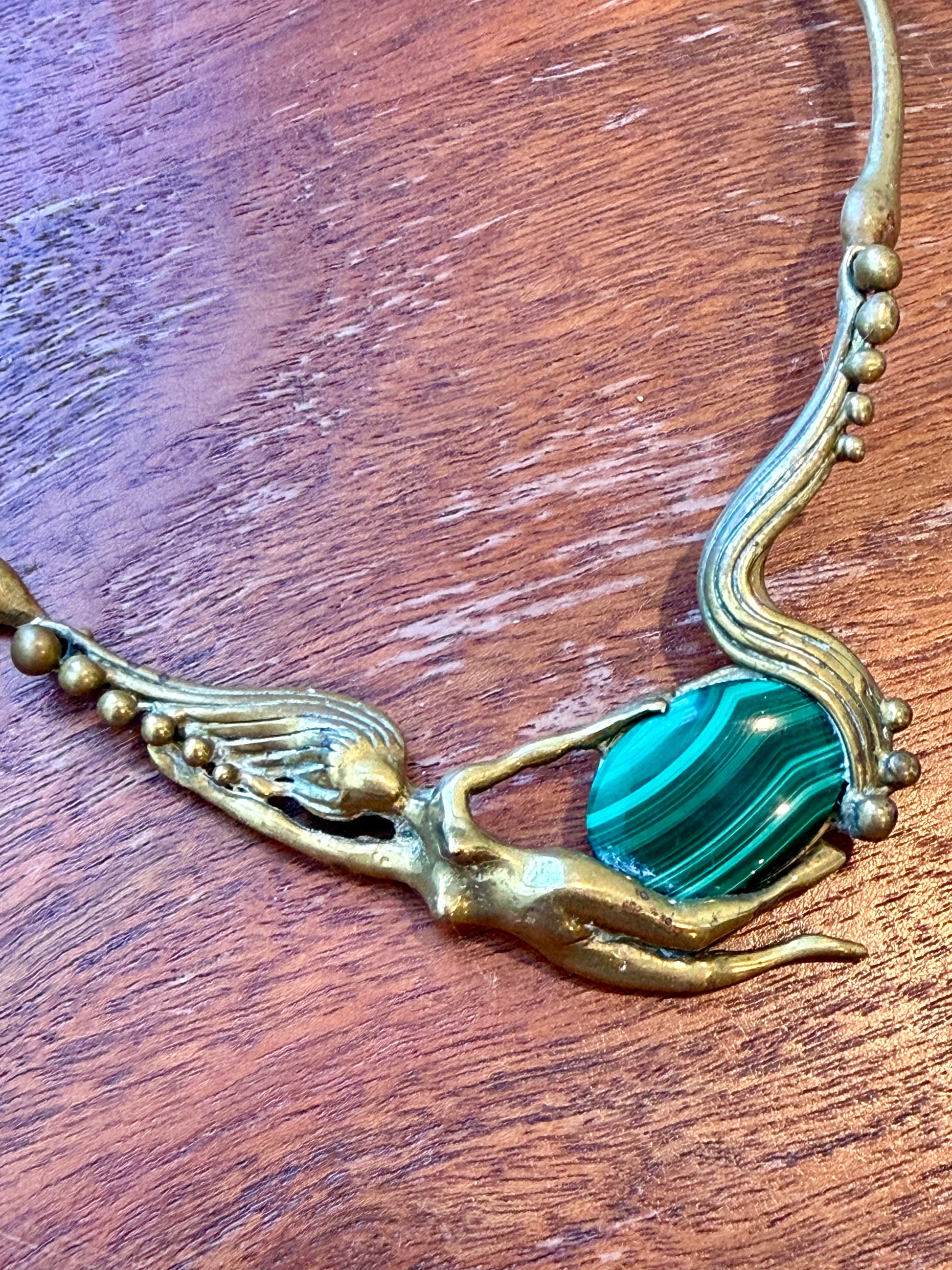 Vintage brutalist and Art Nouveau-style brass collar necklace that is elsewhere attributed to Stephen Burr (this piece does not appear to be signed). Beautiful green striped malachite stone in the center with a hooked closure.