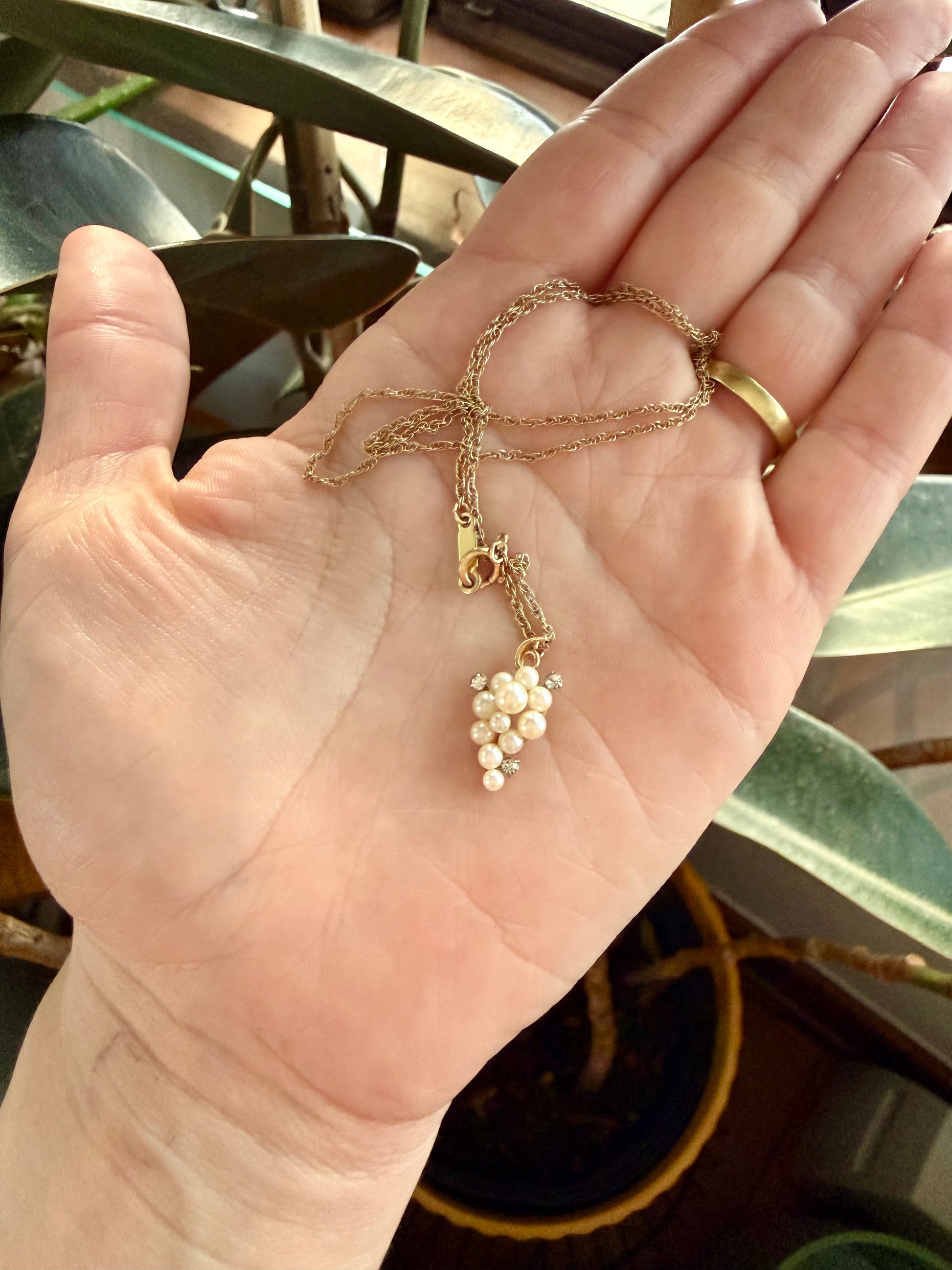 Vintage faux seed pearl and rhinestone grape cluster pendant on a delicate gold tone chain. Signed Krementz.