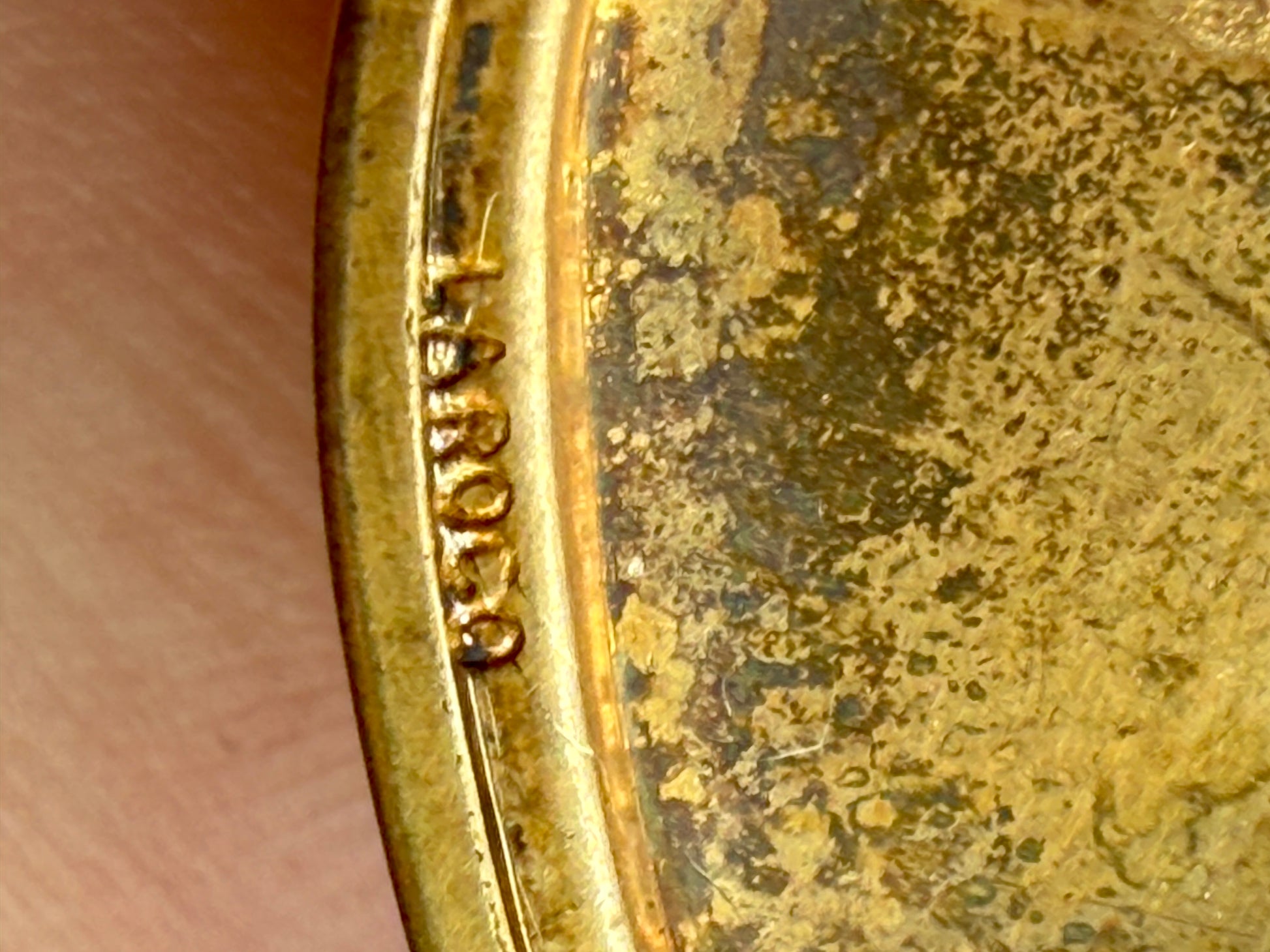 This piece is probably from around the 1950's and appears to once have had enameled accents atop the gold. It has the older style spring ring clasp without the larger "handle" on it (what else would you call that?!).