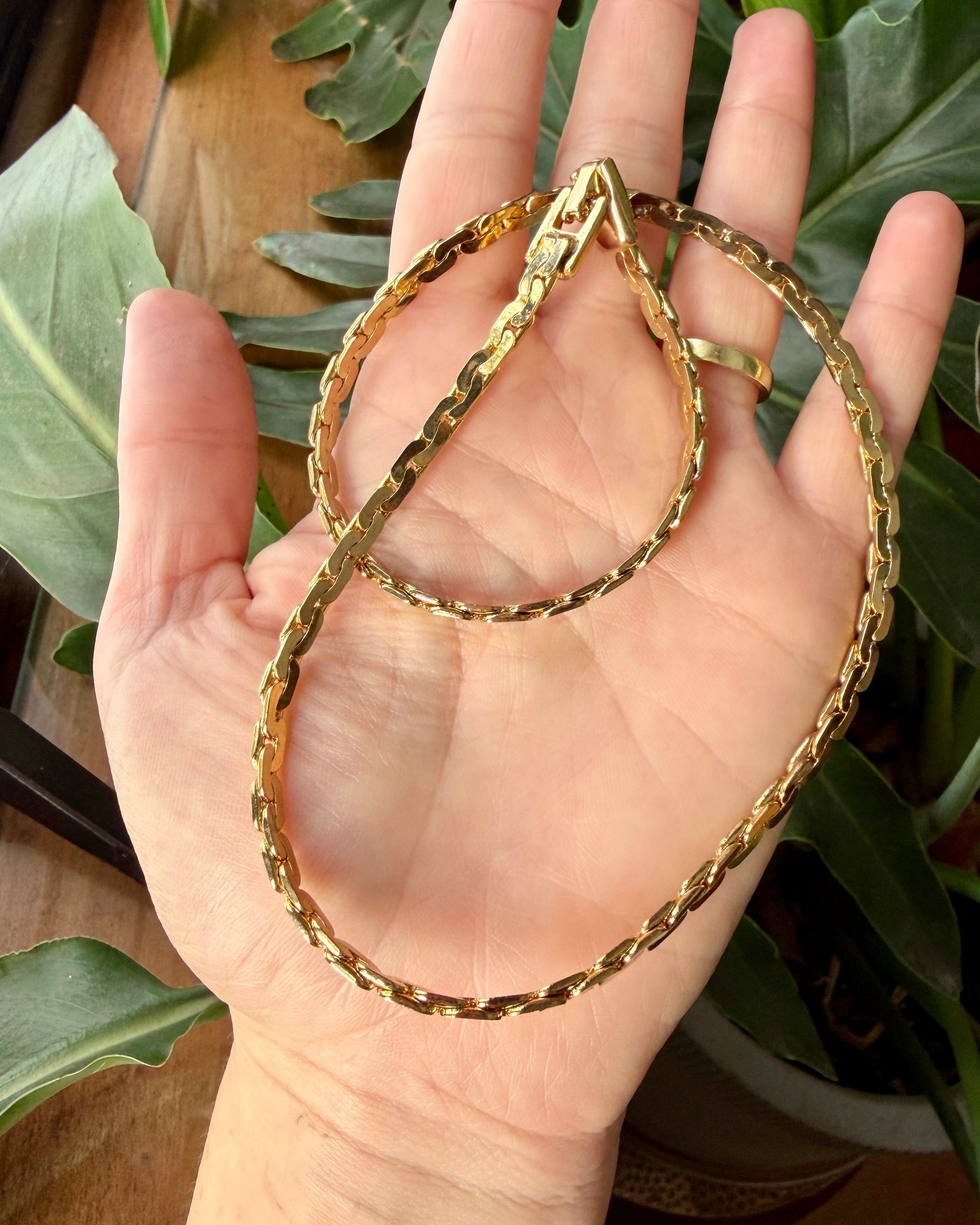 Vintage gold tone (probably gold plated, it's hefty) c-link chain necklace. Beautiful bright buttery gold color that is best represented in the first 2 photos. No makers marks.
