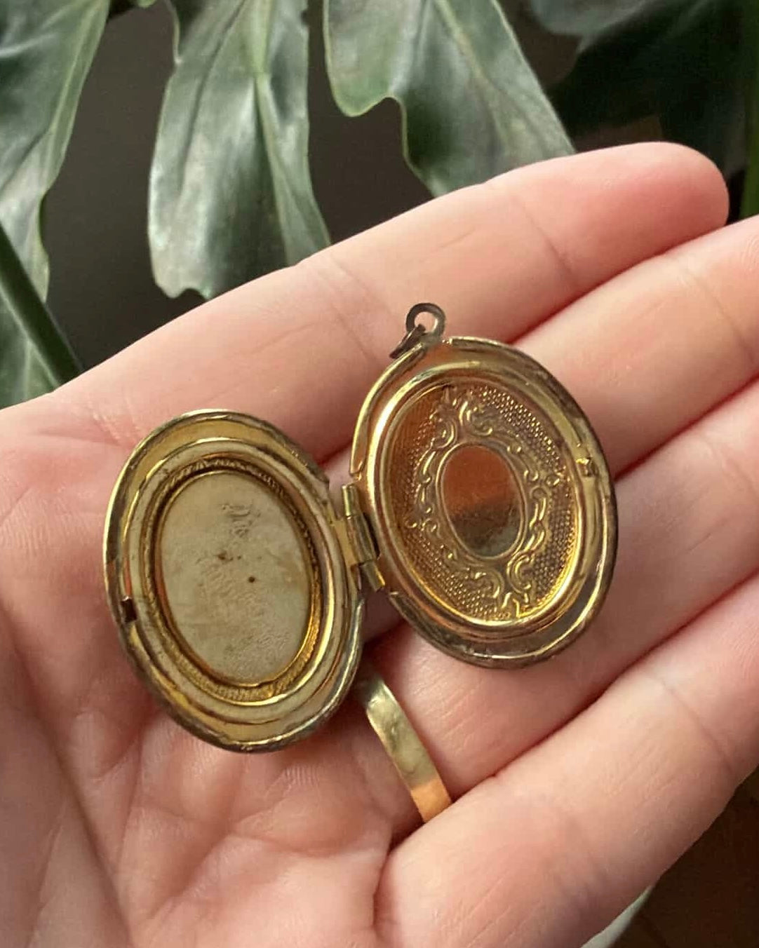 Vintage cameo locket pendant. It's a little brassy, so it could be brass or it could be a worn gold plate over brass. This is reflected in the price. Our best guess is that this is an imitation cameo and that it's not a real carved shell.