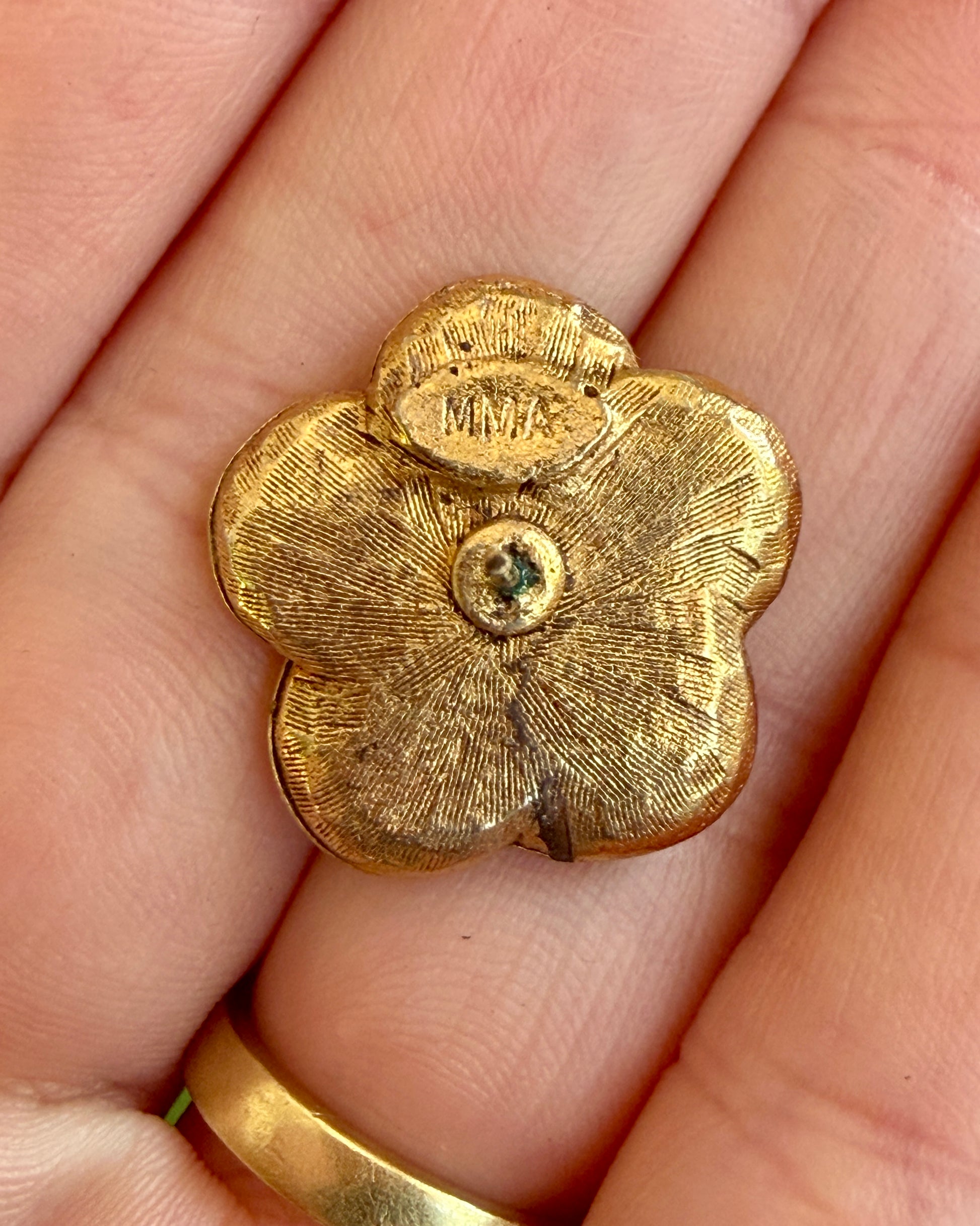 Vintage MMA (Metropolitan Museum of Art) gold tone flower earrings with likely faux turquoise cabochon centers.